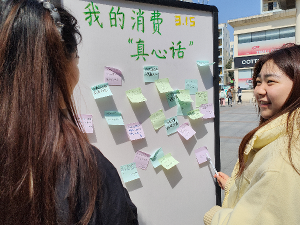 活动特设”我的消费’真心话’“留言板,邀请同学们写下消费经历与参与感悟。短短两小时内,留言板贴满各色便利贴——”原来’退一赔三’不是梦”“维权不是找茬,是底气”“以前忍气吞声,现在知道打12315了”……一句句朴实话语,折射出青年学子从”被动忍受”到”主动维权”的意识转变。