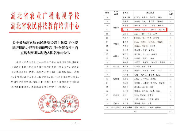 9月30日,第三届湖北省农村电商直播大赛公布入围名单,京山市马岭村“首梦天地”工作站直播小组成功入围。该团队由马岭村党支部书记助理胡颖波、京山本地人秦江涛以及武昌首义学院新法学院学生冯依凡与孔畑田四人组成,凭借多场高质量助农直播,首次将马岭村的特色农产品带上全省舞台。