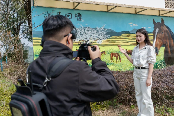 在村口文化墙前,学生与村民围谈乡村变迁。村民马大爷指着文化墙上的领头马画像说道,这一形象承载着乡贤返乡带头建设家乡的奋斗记忆,如今文化墙不仅美化村容村貌,更成为传承“九马回槽”实干精神的载体。春节期间,村民齐聚墙下写春联,老少同乐的场景,亦成为乡村精神文化生活富足的生动缩影。这些鲜活的现场素材同步回传至村委会议室,编辑部学生结合前期策划,一边跟进直播内容,一边快速进行短视频剪辑与图文稿件撰写,将乡村文化振兴的生动细节转化为可传播的融媒内容,实现采访与编辑的同步推进。