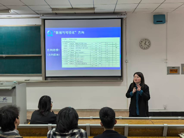 会议伊始,樊国庆围绕专业课程体系展开详细讲解,全面解读专业四大课程类型:通识教育课程、学科基础课程、专业核心课程以及专业(方向)选修课程。其中,重点介绍了选修课程中的两大核心方向:数据与可视化、新媒体运营,明确两个方向的课程设置、学习重点及适配的职业发展路径,强调学生需结合自身兴趣、审美特质及职业规划,理性选择适配自己的发展方向,同时详解了两大方向的学分要求、课程模块及实践重点,让学生对专业方向有了系统认知。